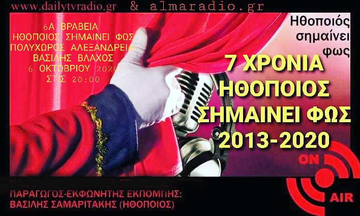Τα έκτα θεατρικά βραβεία «Ηθοποιός Σημαίνει Φως», στον Πολυχώρο Αλεξάνδρεια – Βασίλης Βλάχος, στον κήπο, στις 6 Οκτωβρίου 2020, στις 20:00.Μία βραδιά αφιερωμένη στον αγαπημένο κονφερασιέ-ηθοποιό- στιχουργό Γιώργο ΟικονομίδηΕπετειακή εκδήλωση, 7 χρόνων (2013-2020), της εκπομπής «Ηθοποιός Σημαίνει Φως» ( 2013-2017, στο daily.gr & 2017-2020 στο almaradio.gr), με τον ηθοποιό Βασίλη Σαμαριτάκη & 6α Θεατρικά Βραβεία «Ηθοποιός Σημαίνει Φως» 2019-2020Μία βραδιά αφιερωμένη στον αείμνηστο Γιώργο Οικονομίδη Τετάρτη 6 Οκτωβρίου 2020 στις 20.00Τα 6α θεατρικά βραβεία «Ηθοποιός Σημαίνει Φως», (1α, 4α και 5α στο Σπίτι του ηθοποιού και τα 2α & τα 3α στο θέατρο Χυτήριο), συνεχίζουν στον υπέροχο κήπο, στον Πολυχώρο Αλεξάνδρεια- Βασίλη Βλάχος , εκεί θα γίνει η 6η κατά σειρά επετειακή εκδήλωση 7 ετών της εκπομπής «Ηθοποιός Σημαίνει Φως».