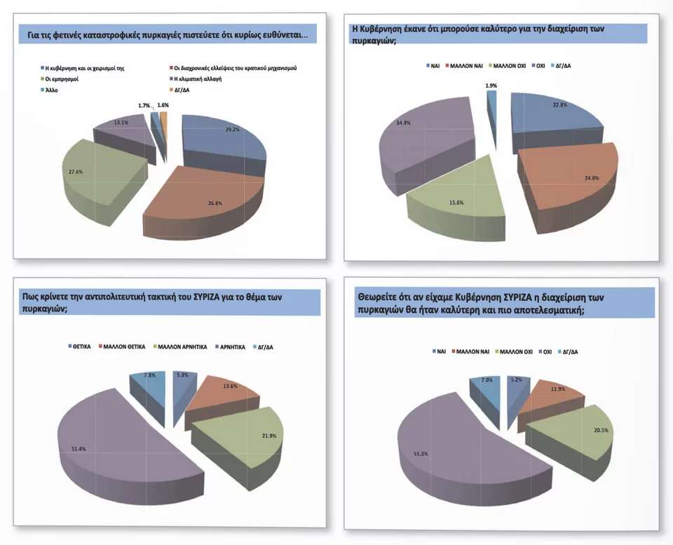 Η ΝΔ συγκεντρώνει ποσοστό 35% και ο ΣΥΡΙΖΑ 21,1%. Ωστόσο οι καταστροφικές πυρκαγιές του καλοκαιριού είχαν κόστος για την κυβέρνηση, καθώς η ΝΔ έχει χάσει έδαφος, αφού η διαφορά αν και παραμένει διψήφια, είναι μειωμένη κατά 2,1% σε σχέση με την έρευνα της Opinion Poll τον Ιούλιο.