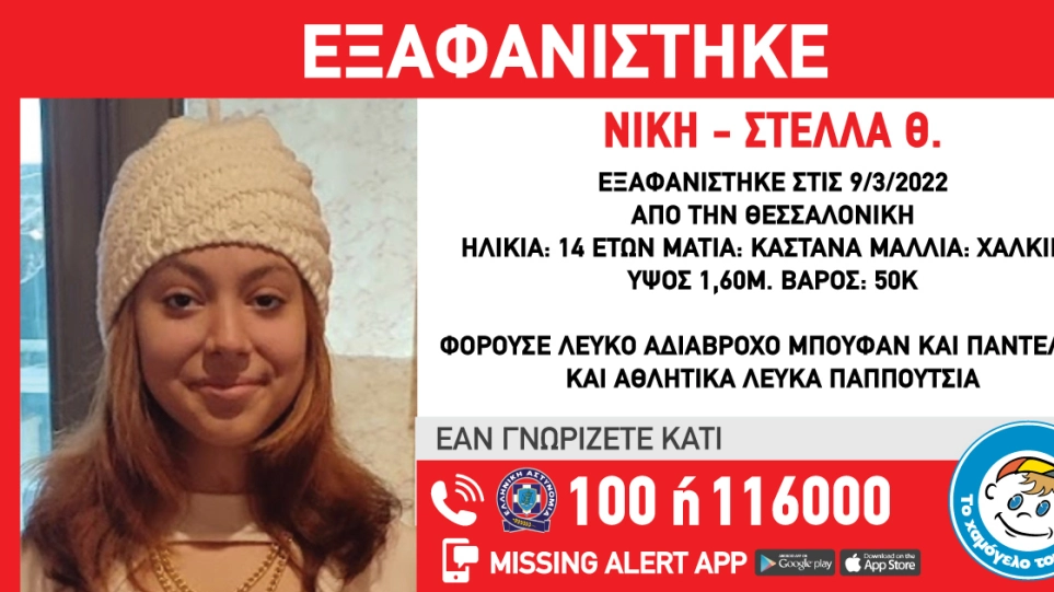 Συναγερμός έχει σημάνει από την Τετάρτη 9 Μαρτίου στη Θεσσαλονίκη, καθώς εξαφανίστηκε η 14χρονη Νίκη – Στέλλα Θ. ελληνικής καταγωγής.