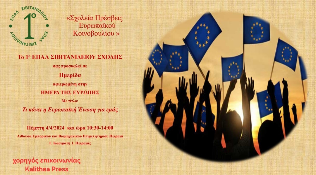 Ημερίδα πραγματοποιεί το 1ο ΕΠΑΛ ΣΙΒΙΤΑΝΙΔΕΙΟΥ στο Πλαίσιο του Προγράμματος «Σχολεία Πρέσβεις του Ευρωπαϊκού Κοινοβουλίου» με θέμα «Τι κάνει η Ευρωπαϊκή Ένωση για εμάς» την Πέμπτη 4 Απριλίου 2024 στο Οικονομικό και Βιομηχανικό Επιμελητήριο Πειραιά (ΕΒΕΠ), Γ. Κασιμάτη 1, Πειραιάς