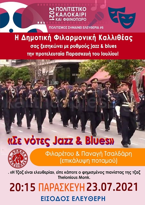 Παρασκευή 23 Ιουλίου η Δημοτική Φιλαρμονική Καλλιθέας στις 20:15 μας ταξιδεύει «Σε νότες Jazz & Blues» Φιλαρέτου & Παναγή Τσαλδάρη (επικάλυψη ποταμού) στα πλαίσια των εκδηλώσεων Πολιτιστικό Καλοκαίρι και Φθινόπωρο 2021 Δήμου Καλλιθέας