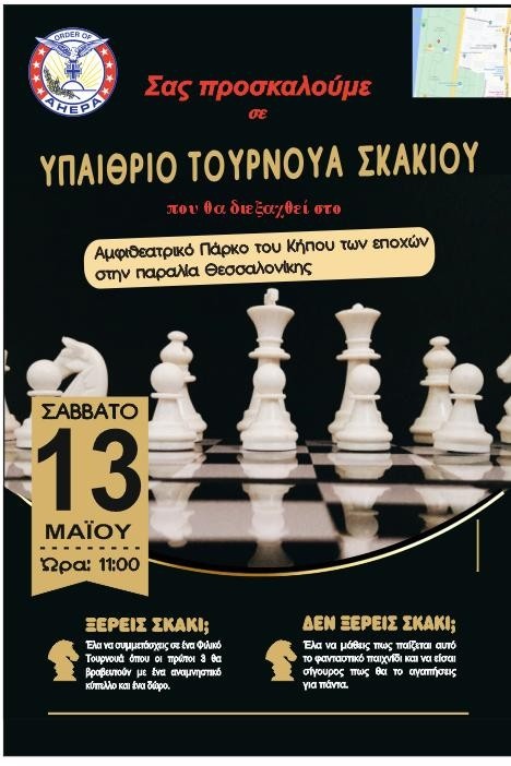 Τα τοπικά τμήματα ΑHEPA HELLAS της ευρύτερης περιοχής της Θεσσαλονίκης και το τμήμα 601 [Κωνσταντινούπολη] διοργανώνουν το Σάββατο 13 Μαΐου 2023 και ώρα 11.00, υπαίθριο τουρνουά Σκακιού, στο αμφιθεατρικό πάρκο του κήπου των Εποχών, στην Νέα Παραλία Θεσσαλονίκης.