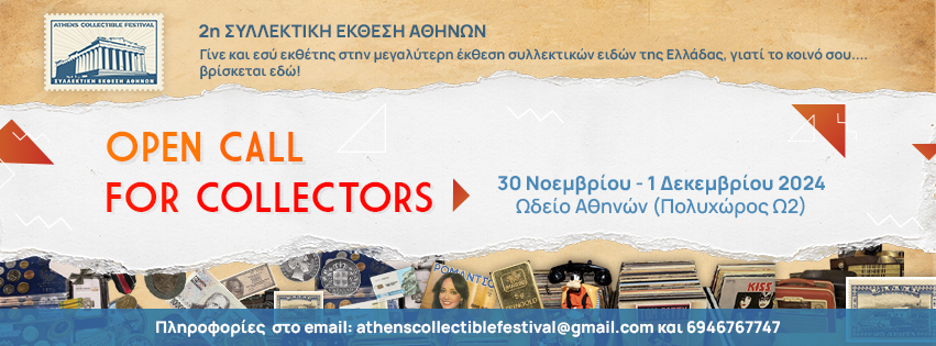 Στις 30 Νοεμβρίου και την 1η Δεκεμβρίου 2024, στο ΩΔΕΙΟ ΑΘΗΝΩΝ, διοργανώνεται η δεύτερη μεγάλη έκθεση συλλεκτικών ειδών υπό τον τίτλο “ATHENS COLLECTIBLE FESTIVAL” – «Συλλεκτική Έκθεση Αθηνών».