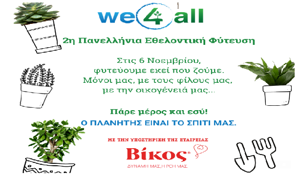 Με αφορμή τις καταστροφικές πυρκαγιές του καλοκαιριού o Μη Κερδοσκοπικός Περιβαλλοντικός Οργανισμός We4all, με την υποστήριξη της εταιρείας Βίκος, διοργανώνει στις 6 Νοεμβρίου 2021 τη 2η Πανελλήνια Εθελοντική Φύτευση και προσκαλεί όλους τους πολίτες να φυτέψουν ένα φυτό, ένα λουλούδι, ένα δεντράκι, όπου βρίσκονται και όπου επιτρέπεται από τον Δήμο μας ή το δασαρχείο: στο σπίτι, στο γραφείο, στον κήπο, στη βεράντα, στην ταράτσα, στο πάρκο, στην εξοχή. Εκτός βεβαίως από εδάφη που κάηκαν πρόσφατα, στα οποία υπήρχαν δέντρα.