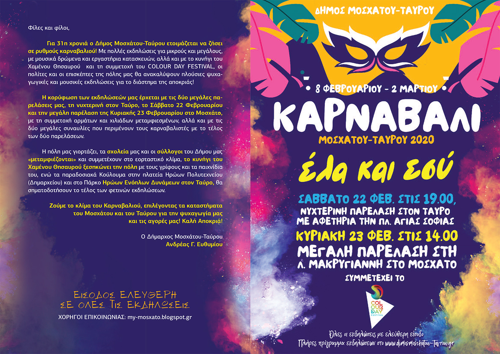 Για 31η χρονιά ο Δήμος Μοσχάτου-Ταύρου ετοιμάζεται να ζήσει σε ρυθμούς Καρναβαλιού! Με πολλές εκδηλώσεις για μικρούς και μεγάλους, με μουσικά δρώμενα και εργαστήρια κατασκευών, αλλά και με το Κυνήγι του Χαμένου Θησαυρού και τη συμμετοχή του COLOUR DAY FESTIVAL, οι πολίτες και οι επισκέπτες της πόλης μας θα ανακαλύψουν πλούσιες ψυχαγωγικές και μουσικές εκδηλώσεις για το διάστημα της αποκριάς!