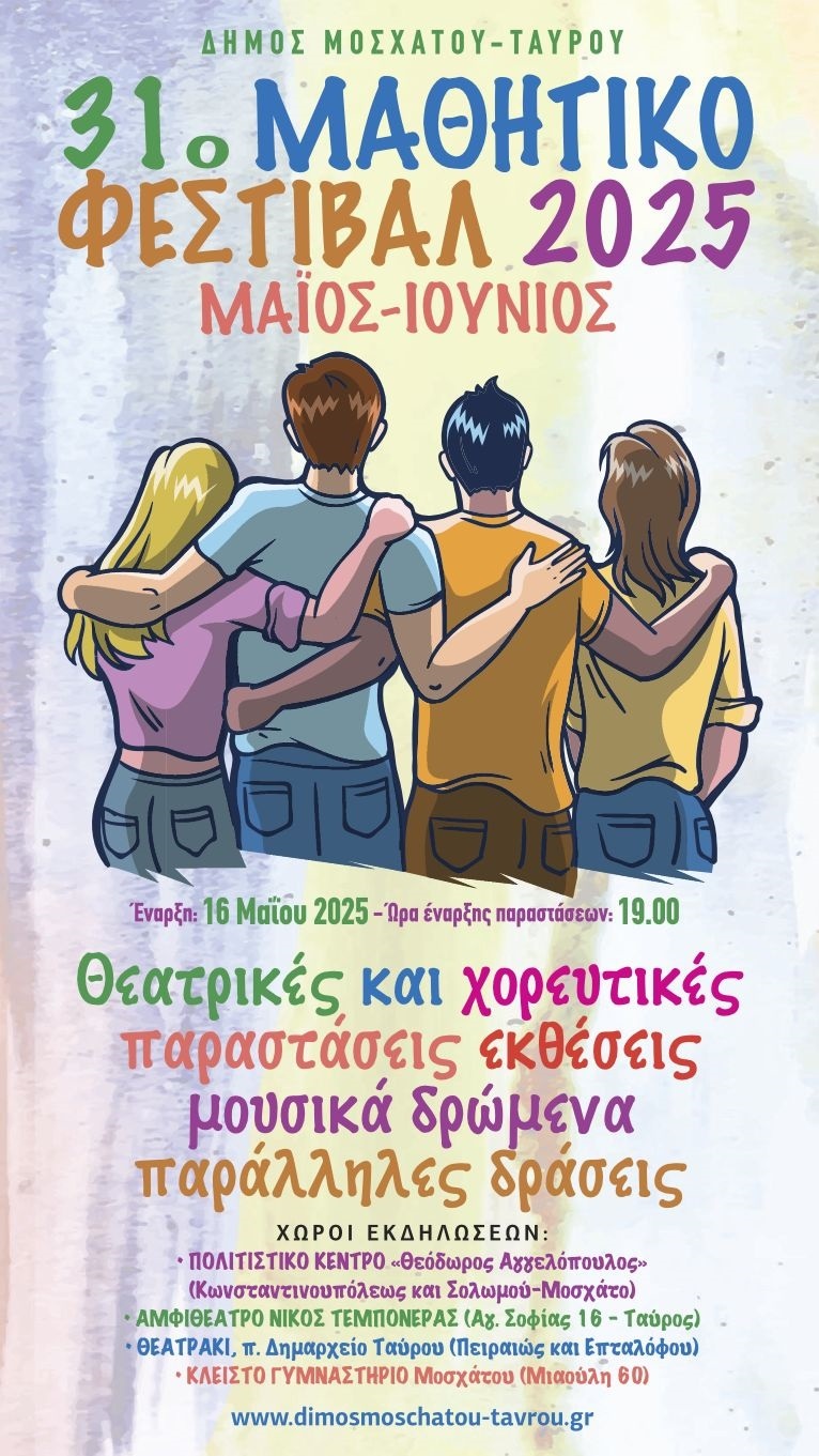 νΞεκινάει στον Δήμο Μοσχάτου-Ταύρου το 31ο Μαθητικό Φεστιβάλ, ένας πολιτιστικός θεσμός που έχει πλέον καθιερωθεί στην τοπική κοινωνία και αποτελεί γιορτή δημιουργίας, έκφρασης και συνεργασίας για τη μαθητική και εκπαιδευτική κοινότητα του Δήμου μας.