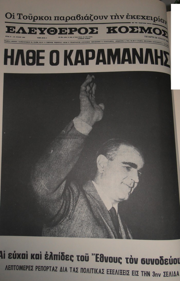Τα ξημερώματα τις 24ης Ιουλίου 1974 ο πρώην πρωθυπουργός της Ελλάδας, Κωνσταντίνος Καραμανλής επιστρέφει από το Παρίσι. Κατά την κρίσιμη αυτή στιγμή για τη χώρα θα αναλάβει την ηγεσία κυβέρνησης «Εθνικής Ενότητας», προκειμένου να αποκατασταθεί το δημοκρατικό πολίτευμα και να βγει η Ελλάδα από τον κυκεώνα των καταστροφικών γεγονότων που προκάλεσε η χούντα των συνταγματαρχών, με αποκορύφωμα αυτών το πραξικόπημα κατά του Μακαρίου και την Τουρκική εισβολή στην Κύπρο που ακολούθησε.
