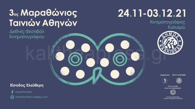 O Δήμος Καλλιθέας φιλοξενεί, με ελεύθερη είσοδο για το κοινό, από την Τετάρτη 24 Νοεμβρίου έως και την Παρασκευή 3 Δεκεμβρίου, στον Δημοτικό Κινηματογράφο Καλλιθέας Καλυψώ. (Γρηγ. Λαμπράκη 9 και Καλυψούς), το 3ο Διεθνές Φεστιβάλ Κινηματογράφου: Μαραθώνιος ταινιών Αθηνών (Athens Marathon International Film Festival). Το 3ο Διεθνές Φεστιβάλ Κινηματογράφου επιχορηγείται από το Υπουργείο Πολιτισμού και Αθλητισμού και οι προβολές ξεκινούν καθημερινά στις 7 μ.μ. και διαρκούν έως τις 11.00 μ.μ.