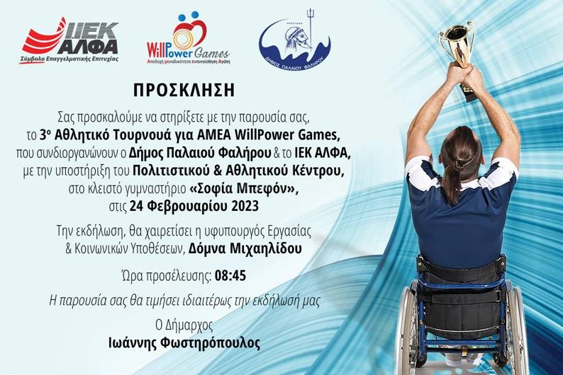 Το 3o Αθλητικό Τουρνουά ΑμεΑ WILLPOWER GAMES από τα ΙΕΚ ΑΛΦΑ και την BELIEVE, διοργανώνεται υπό την αιγίδα του Δήμου Παλαιού Φαλήρου και του Πολιτιστικού Αθλητικού Κέντρου (ΠΟ.Α.ΚΕ), με συμμετοχή των μεγαλύτερων συλλόγων ΑμεΑ της Αττικής. Θα πάρουν μέρος 3 Παραολυμπιονίκες και περισσότεροι από 200 αθλητές. Την εκδήλωση θα τιμήσει με την παρουσία της και θα χαιρετήσει, η Υφυπουργός Εργασίας & Κοινωνικών Υποθέσεων Δόμνα Μιχαηλίδου.