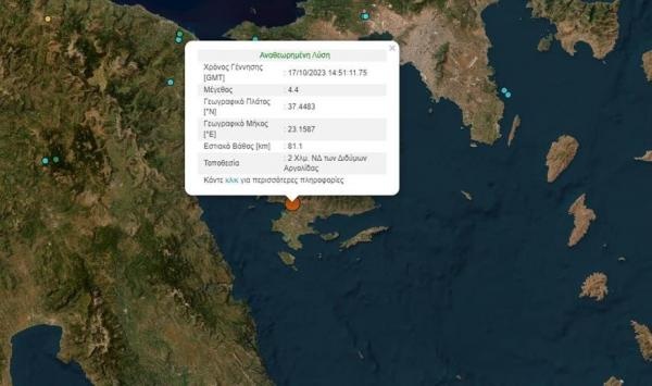 Σεισμική δόνηση μεγέθους 4,4 βαθμών της κλίμακας Ρίχτερ σημειώθηκε περίπου δέκα λεπτά πριν τις 18.00 το απόγευμα της Τρίτης στην περιοχή της Αργολίδας. Συγκεκριμένα σύμφωνα με το Γεωδυναμικό Ινστιτούτο το επίκεντρο εντοπίζεται 2χλμ νοτιοδυτικά από το χωριό Δίδυμα με εστιακό βάθος 81,1χλμ.
