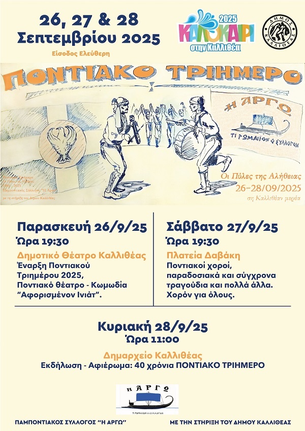 Το ιστορικό φεστιβάλ «Ποντιακό Τριήμερο», που διοργανώνεται από τον Παμποντιακό Σύλλογο ΑΡΓΩ, στο Δήμο Καλλιθέας συμπληρώνει φέτος 40 χρόνια και ετοιμάζεται να γεμίσει την κεντρική πλατεία της πόλης με πολιτιστικές εκδηλώσεις. Αρχίζει την Παρασκευή 26 έως την Κυριακή 28 Σεπτεμβρίου, κάτοικοι και επισκέπτες θα έχουν την ευκαιρία να παρακολουθήσουν παραδοσιακούς χορούς, ποντιακά μουσικά σχήματα, θεατρικά δρώμενα και να συμμετάσχουν σε εκδηλώσεις που αναδεικνύουν την ιστορία και τον πολιτισμό του Ποντιακού Ελληνισμού.