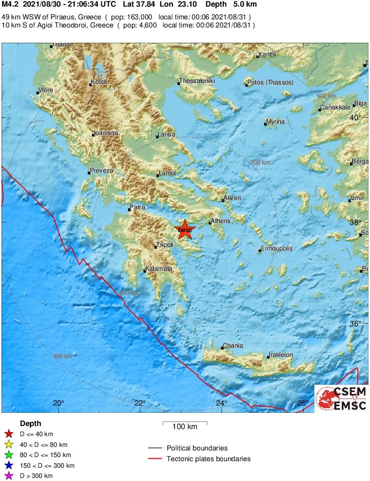 Παράλληλα το ευρωπαικό σεισμολογικό κέντρο αναφέρει για 4,4 ρίχτερ. Το επίκεντρο του σεισμού εντοπίζεται σε θαλάσσιο χώρο 19 χιλιόμετρα νοτιοανατολικά της Κορίνθου.Το εστιακό βάθος της δόνησης, η οποία σημειώθηκε στις 00.06 π.μ., εκτιμάται στα 14,5 χιλιόμετρα. περισσότερα σε λίγο…