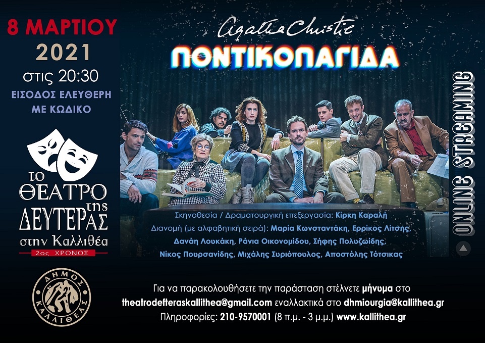 Με την ΠΟΝΤΙΚΟΠΑΓΙΔΑ της Αγκάθα Κρίστι, σε σκηνοθεσία Κίρκης Καραλή, συνεχίζονται στις 8 Μαρτίου, οι φετινές παραστάσεις του «Θεάτρου της Δευτέρας στην Καλλιθέα», διαδικτυακά.