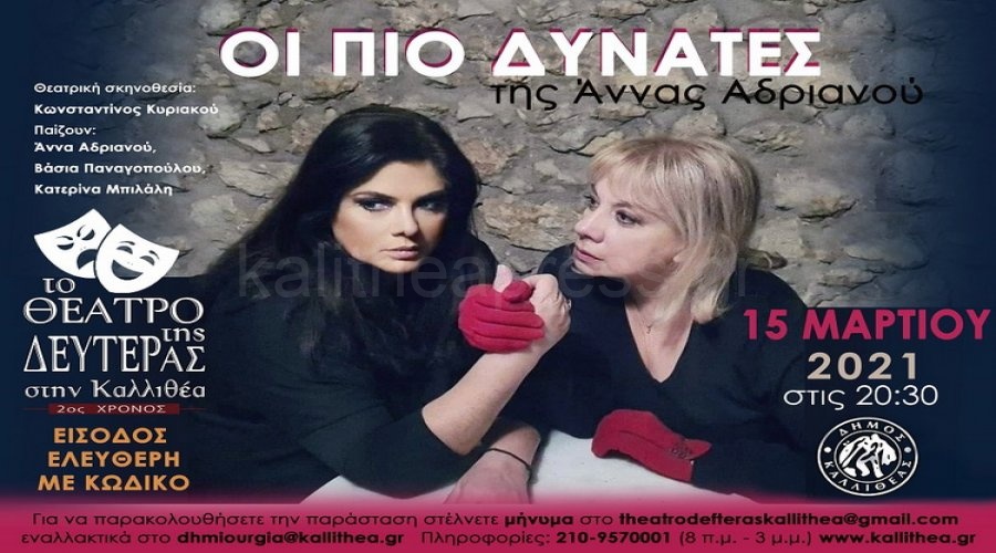 Με τις ΠΙΟ ΔΥΝΑΤΕΣ της Άννας Ανδριανού, σε σκηνοθεσία Κων/νου Κυριακού, συνεχίζονται στις 15 Μαρτίου, οι φετινές παραστάσεις του «Θεάτρου της Δευτέρας στην Καλλιθέα», διαδικτυακά.