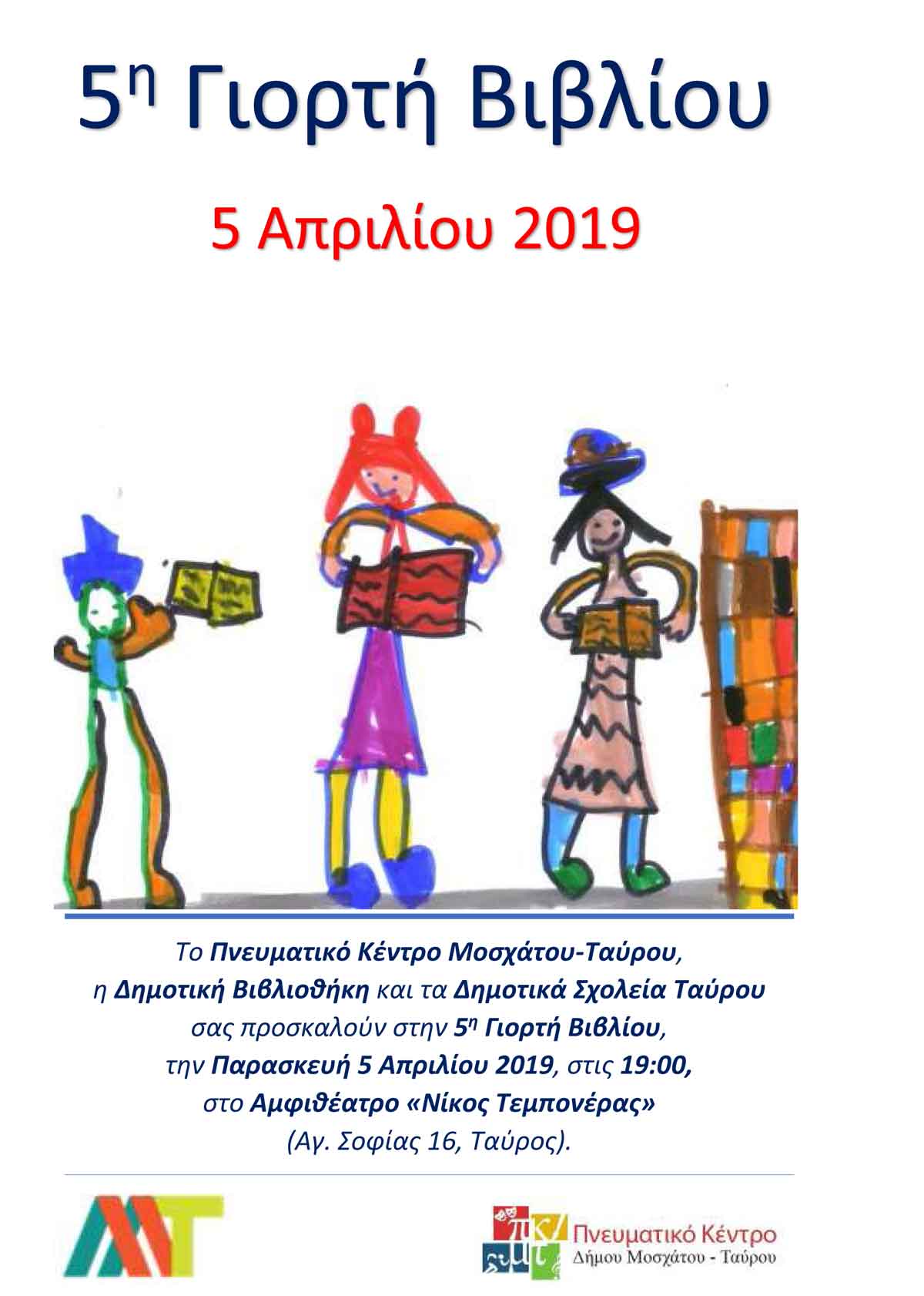 Το ΠΝΕΥΜΑΤΙΚΟ ΚΕΝΤΡΟ του Δήμου ΜΟΣΧΑΤΟΥ – ΤΑΥΡΟΥ, με αφορμή την Παγκόσμια Ημέρα Παιδικού Βιβλίου, διοργανώνει την Παρασκευή 5 Απριλίου, στις 7 το απόγευμα, στο Αμφιθέατρο «Νίκος Τεμπονέρας» στον Ταύρο, την 5η Γιορτή Βιβλίου 2019, με τίτλο «Με ένα βιβλίο αλλάζω». Στη γιορτή θα συμμετάσχουν τα Δημοτικά Σχολεία της Δημοτικής Κοινότητας Ταύρου του Δήμου Μοσχάτου-Ταύρου.