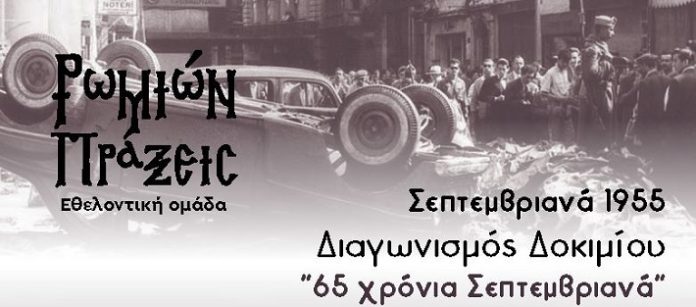 Η Eθελοντική Oμάδα «Ρωμιών Πράξεις» σε συνεργασία με τους Δήμους Αλίμου και Π. Φαλήρου και με αφορμή την 65η επέτειο του πογκρόμ κατά των Ελλήνων της Κωνσταντινούπολης τον Σεπτέμβριο του 1955, συνδιοργανώνουν Πανελλήνιο διαγωνισμό δοκιμίου με τίτλο «Σεπτεμβριανά του ‘55» και παράλληλα εικαστικό διαγωνισμό για τη δημιουργία εξωφύλλου που θα κοσμήσει την ειδική έκδοση που θα συμπεριλάβει τα δοκίμια που θα διακριθούν.