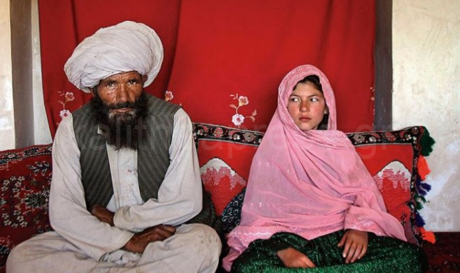 «Ένα 11χρονο κορίτσι στην Γκόουρ στο Αφγανιστάν κάθεται δίπλα στον αρραβωνιαστικό της, ο οποίος εκτιμάται ότι διανύει τη δεκαετία των 40, στην τελετή των αρραβώνων τους, λίγο πριν τον γάμο τους, το 2005», αναφέρει χαρακτηριστικά στη λεζάντα η φωτογράφος.