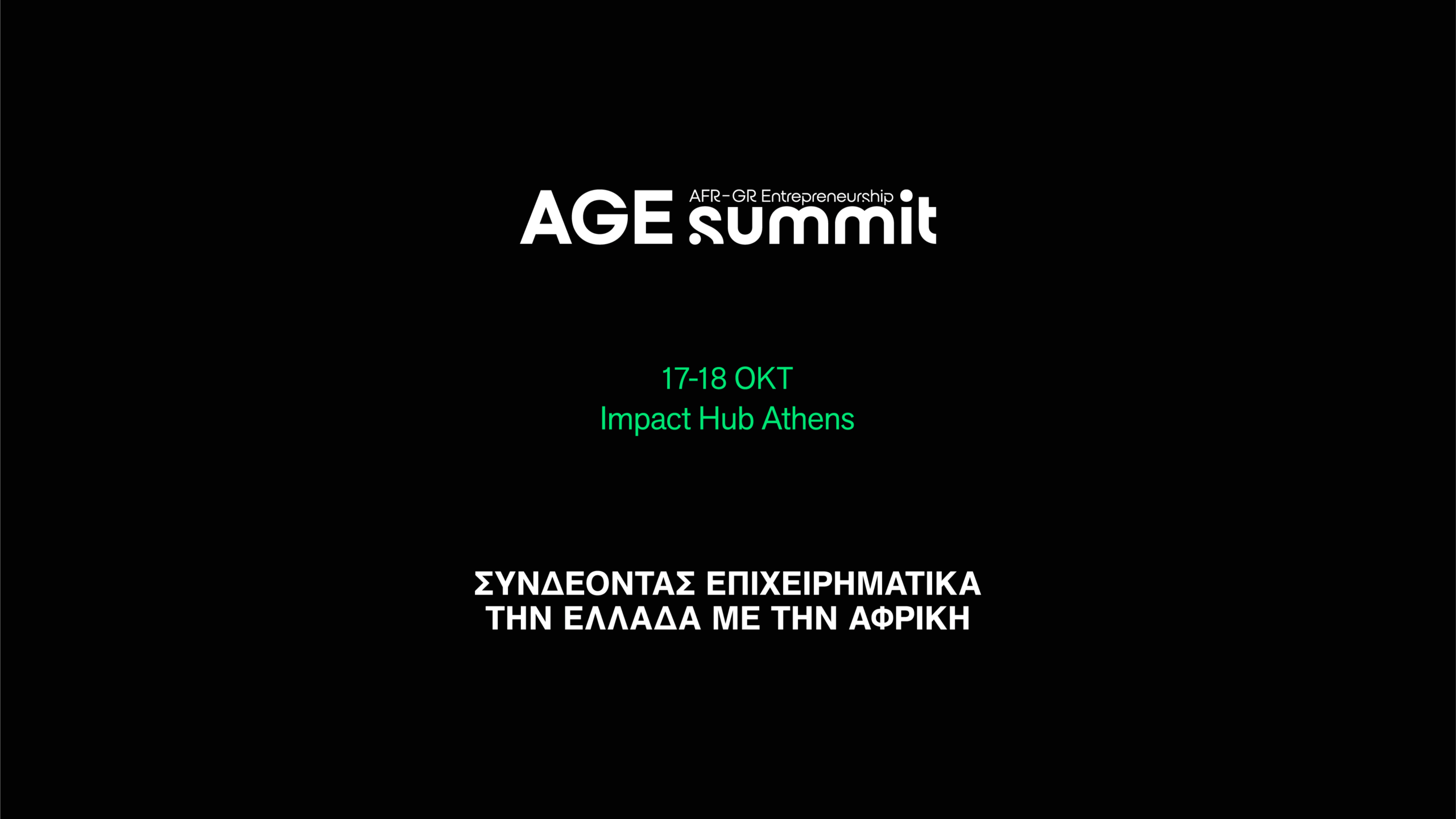 Το Africa-Greece Entrepreneurship Summit (AGE Summit) πραγματοποιείται στις 17 και 18 Οκτωβρίου 2025, στο Impact Hub Athens, στο κέντρο της Αθήνας. Πρόκειται για το πρώτο διεθνές συνέδριο που φέρνει σε απευθείας διάλογο την Ελλάδα και τις χώρες της Αφρικής, με σημείο αναφοράς την επιχειρηματικότητα, την καινοτομία και τη βιώσιμη ανάπτυξη.