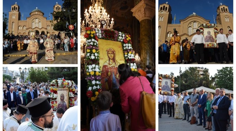 Στην κεντρική Πλατεία της πόλης αναπέμφθηκε η καθιερωμένη δέηση και ο Σεβασμιώτατος Μητροπολίτης κ. Συμεών απηύθυνε προς τους πιστούς χαιρετισμό τονίζοντας μεταξύ άλλων: “O φετινός εορτασμός συμπίπτει με τη συμπλήρωση 100 ετών από την τραγική Μικρασιατική Καταστροφή του 1922. Τότε πού χάθηκε η αλησμόνητη Σμύρνη μας, ἡ πανέμορφη νύμφη της Ιωνίας, ο οφθαλμός της Ανατολής. Τότε που παραδόθηκε στις φλόγες ο ξακουστός Μητροπολιτικός Ναός της αγίας Φωτεινής.ε