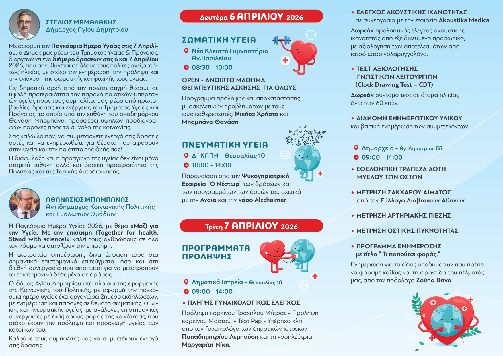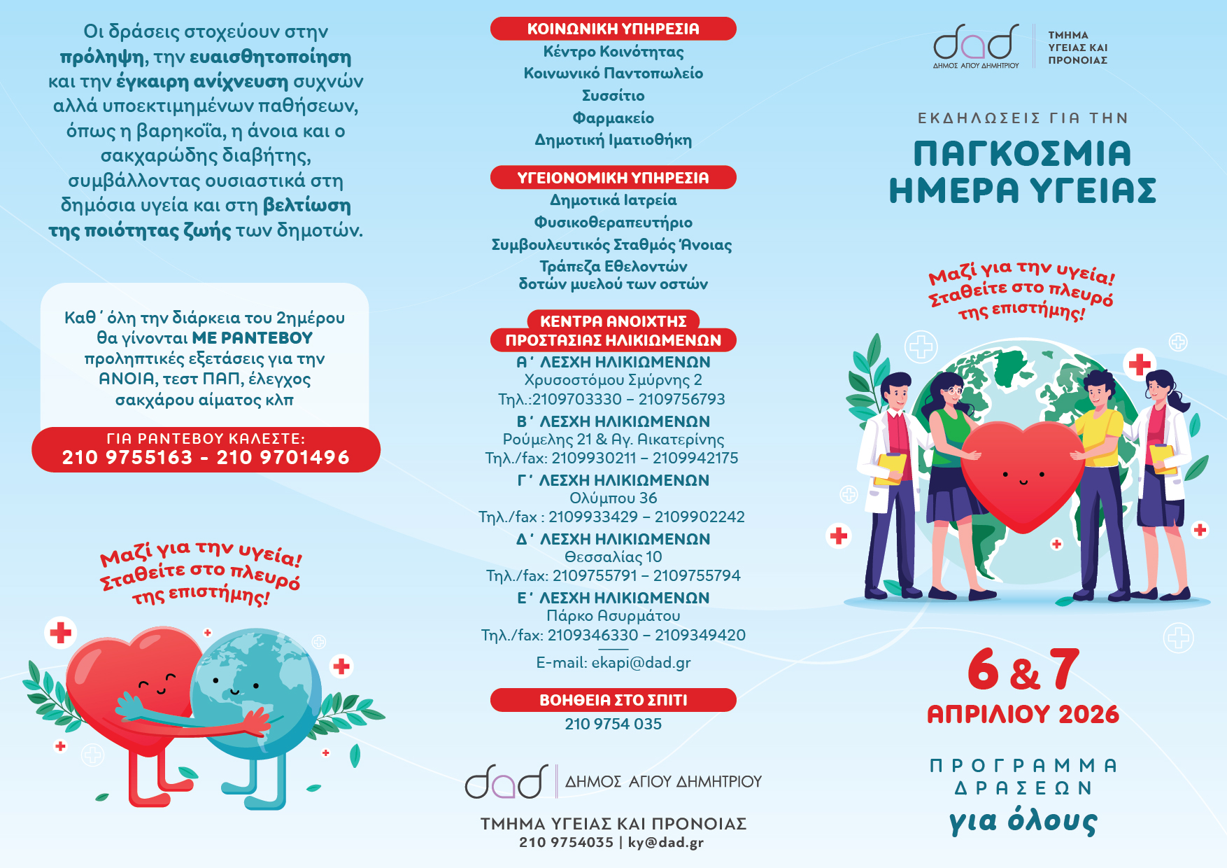 Ο Δήμος Αγίου Δημητρίου ολοκλήρωσε με επιτυχία ένα διήμερο δράσεων αφιερωμένων στην Παγκόσμια Ημέρα Υγείας, στις 6 και 7 Απριλίου 2026, προσφέροντας στους πολίτες δωρεάν εξετάσεις και ενημερωτικά προγράμματα για την πρόληψη και την προαγωγή της υγείας.