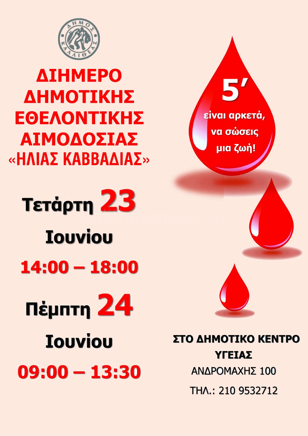 Την Τετάρτη 23 Ιουνίου και Πέμπτη 24 Ιουνίου πραγματοποιείται η δημοτική εθελοντική Αιμοδοσία “ΗΛΙΑΣ ΚΑΒΒΑΔΙΑΣ” στο Δημοτικό Κέντρο Υγείας Καλλιθέας και ώρες Τετάρτη 14.00-18.00 και Πέμπτη 09.00-13.30