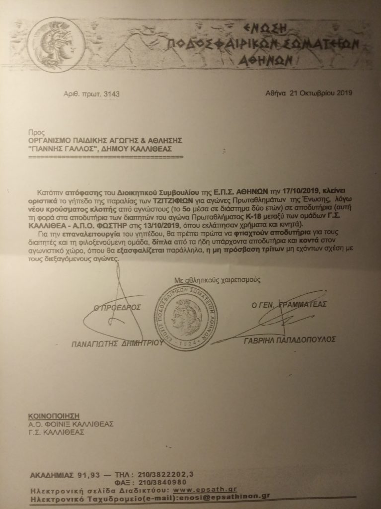 Αυτή η απόφαση θα έχει ως αποτέλεσμα, όλες οι ομάδες της Καλλιθέας που χρησιμοποιούν, σήμερα το Γήπεδο να αγωνίζονται εκτός έδρας.