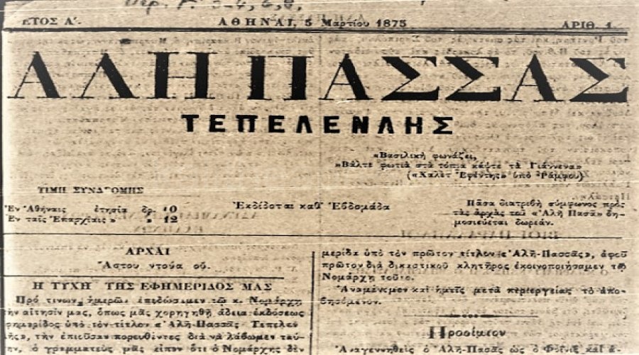 Στα ράφια της Βιβλιοθήκης της Βουλής, είναι στοιβαγμένα μερικά φύλα- όσα διασώθηκαν- μιας παράδοξης σατιρικής εβδομαδιαίας εφημερίδας με τον ασυνήθιστο τίτλο «Αλή Πασάς Τεπελενλής».