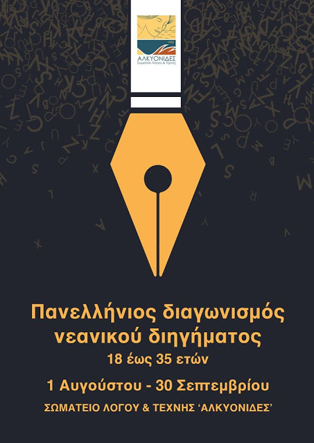 Το Σωματείο Λόγου και Τέχνης με την επωνυμία ‘’ΑΛΚΥΟΝΙΔΕΣ‘’, που εδρεύει στην Κόρινθο, προκηρύσσει Πανελλήνιο Διαγωνισμό Νεανικού Διηγήματος , με ελεύθερο θέμα ,για το έτος 2020 .