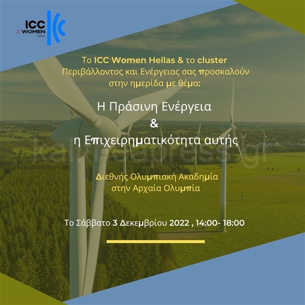 Η Πράσινη Ενέργεια και η Επιχειρηματικότητα αυτής θα βρεθούν στο επίκεντρο της ειδικής ημερίδας που πραγματοποιεί το Σάββατο, 3 Δεκεμβρίου από τις 14:00 μ.μ. έως τις 18:00 μ.μ. στο Αμφιθέατρο της ΔΟΑ στην Αρχαία Ολυμπία από το γυναικείο παράρτημα του Διεθνούς Εμπορικού Επιμελητηρίου ICCWomen και το cluster Περιβάλλοντος και Ενέργειας, ύστερα από πρόσκληση της Προέδρου της Ειδικής Μόνιμης Επιτροπής Προστασίας Περιβάλλοντος της Βουλής, Βουλευτού Ηλείας Διονυσίας Θεοδώρας Αυγερινοπούλου.