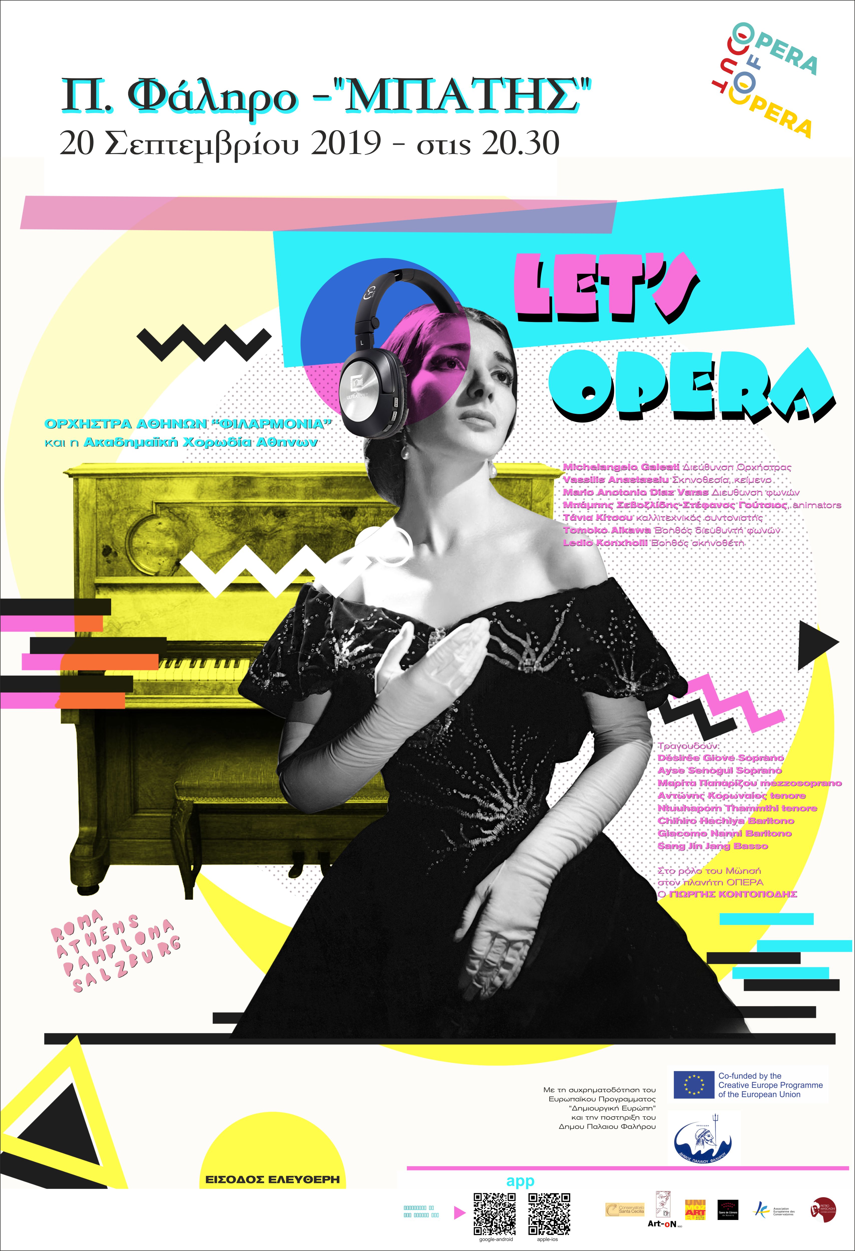 O Δήμος Παλαιού Φαλήρου στο πλαίσιο του προγράμματος OPERA OUT OF OPERA και σε συνεργασία με τους εταίρους του προγράμματος, φιλοξενεί στις 20 Σεπτεμβρίου 2019 και ώρα 20.30, στην εξέδρα του Μπάτη, την κεντρική παράσταση στην Ελλάδα με τίτλο LET’S OPERA.