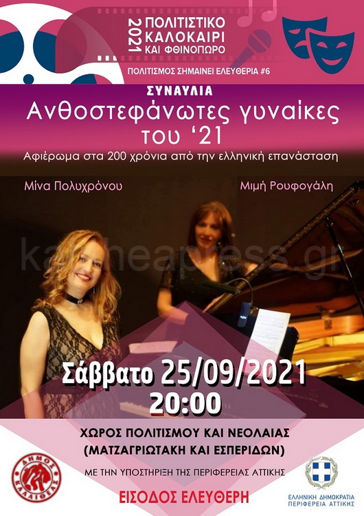 Στα πλαίσια των εκδηλώσεων της Περιφέρειας Αττικής στο Δήμο Καλλιθέας παρουσιάζεται το Σάββατο 25 Σεπτεμβρίου στις 20:00 στο Χώρο Πολιτισμού και Νεολαίας (Ματζαγριωτάκη και Εσπερίδων) «Ανθοστεφάνωτες γυναίκες του ‘21» Επετειακή συναυλία – αφιέρωμα στην ελληνική επανάσταση (Έκτακτη συναυλία)