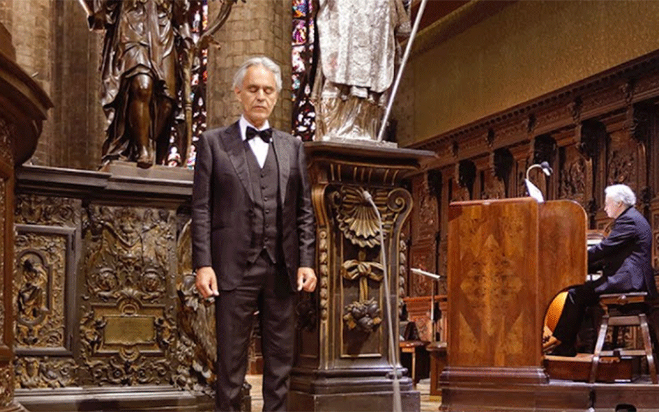 Ο σπουδαίος τενόρος τραγούδησε live για μισή ώρα από τον άδειο καθεδρικό ναό Duomo στο Μιλάνο, πρωτεύουσα της Λομβαρδίας και επίκεντρο της επιδημίας του Covid-19, έχοντας στο πλευρό του μόνο τον οργανοπαίχτη Emanuele Vianelli που τον συνόδευσε.