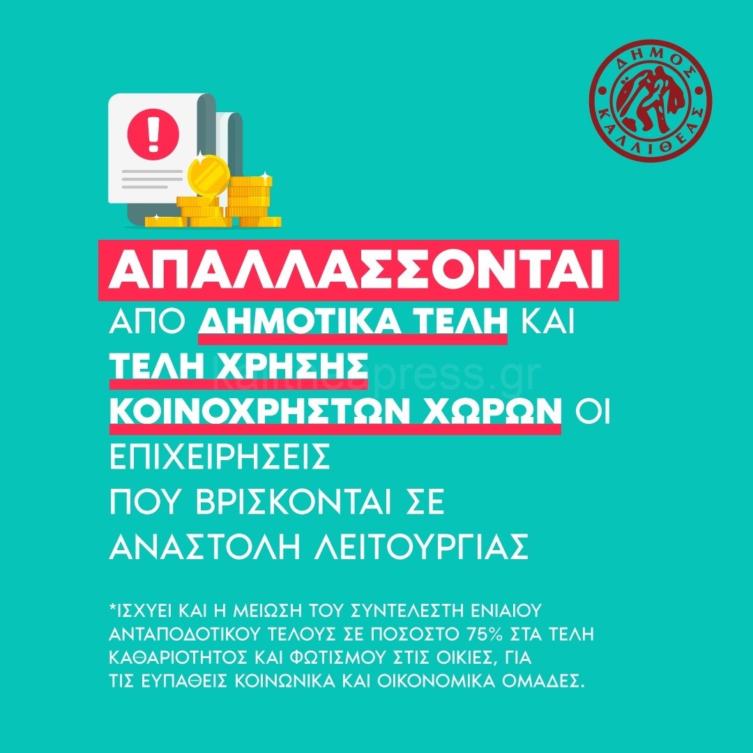 Ειδικότερα, η απόφαση αφορά στην απαλλαγή της καταβολής ανταποδοτικών τελών (τέλη καθαριότητας & φωτισμού φόρος ηλεκτροδοτούμενων χώρων) και των τελών κατάληψης κοινόχρηστων χώρων από τις επιχειρήσεις για όσο χρονικό διάστημα ισχύουν τα περιοριστικά μέτρα για την λειτουργία τους λόγω της πανδημίας.