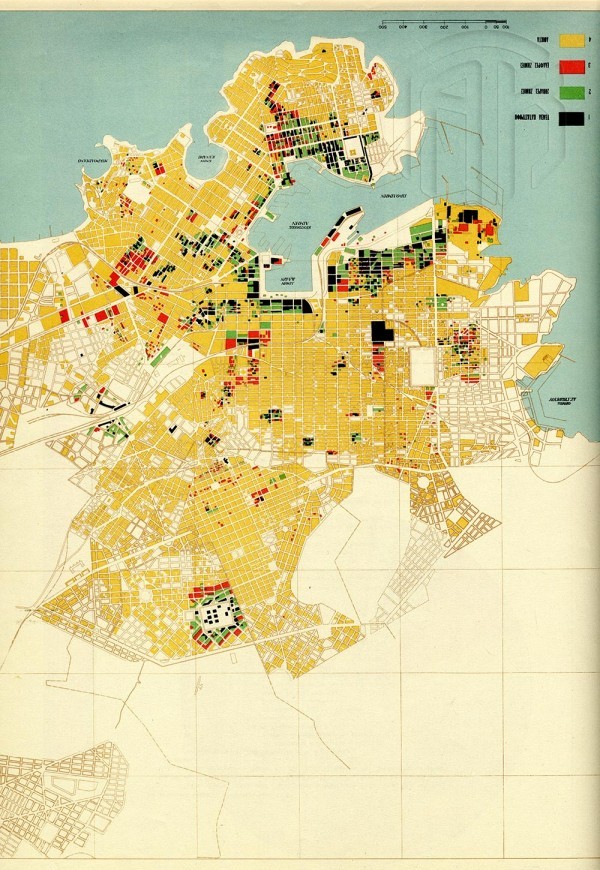 Χάρτης του Πειραιά με επισημάνσεις των περιοχών και του βαθμού των καταστροφών που προκάλεσαν οι Γερμανοί. Υφυπουργείο Ανοικοδομήσεως – Κ. Α. Δοξιάδης (επιμ.), Αι θυσίαι της Ελλάδος στο Δεύτερο Παγκόσμιο Πόλεμο, Αθήνα 1946, Γενικά Αρχεία του Κράτους – Κεντρική Υπηρεσία