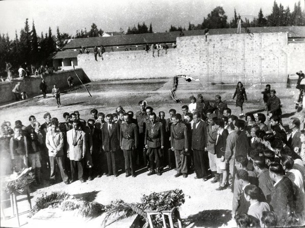 Σκοπευτήριο Καισαριανής. Κατάθεση στεφάνου από τον στρατιωτικό διοικητή του ΕΛΑΣ, στρατηγό Στέφανο Σαράφη, στη μνήμη των εκτελεσμένων αντιστασιακών από τις δυνάμεις Κατοχής. Κατά τη διάρκεια της Κατοχής εκτελέστηκαν στο Σκοπευτήριο της Καισαριανής 645 αντιστασιακοί, Γενικά Αρχεία του Κράτους – Κεντρική Υπηρεσία – Βασίλης Τσακιράκης.