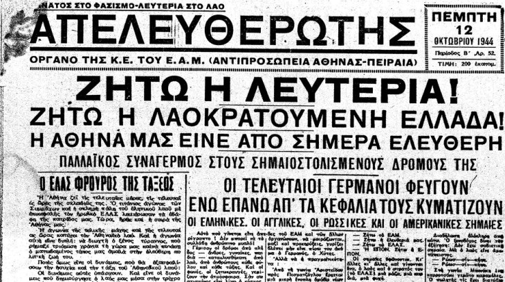 Πριν φύγουν και οι τελευταίοι Ούννοι ο λαός ξεχύθηκε με σημαίες και ζητωκραυγές στους δρόμους. Απ’ το Πανεπιστήμιο, απ’ τις Τράπεζες, απ’ όλα τα κέντρα οι τηλεβόες του ΕΛΑΣ σαλπίζουν το χαρμόσυνο μήνυμα. Οι συνοικίες σε παραλήρημα ενθουσιασμού ετοιμάζονται για το μεγάλο γιορτασμό. Στο μνημείο του Άγνωστου Στρατιώτη αντιπροσωπείες του ΕΑΜ-ΕΛΑΣ κατέθεσαν στεφάνι. Έξαλλος από τον ενθουσιασμό ο συγκεντρωμένος κατά χιλιάδες λαός ζητωκραύγαζε. Δακρύζοντας οι πολίτες αγκάλιαζε ο ένας τον άλλο (…). Η γερμανική σημαία κατέβηκε απ’ την Ακρόπολη και τα τελευταία γερμανικά τμήματα έφυγαν το πρωί απ’ την Αθήνα» (Ριζοσπάστης, 12/10/1944).74 χρόνια συμπληρώνονται σήμερα από την απελευθέρωση της Αθήνας από τους γερμανούς κατακτητές στις 12 Οκτώβρη του 1944.