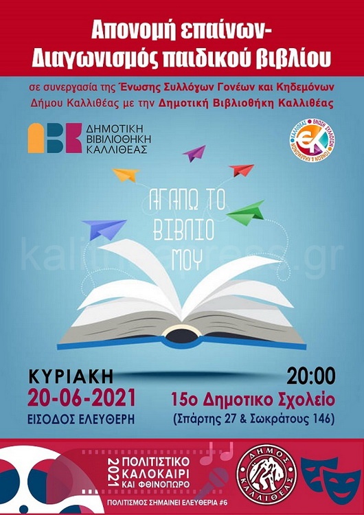 Σήμερα Κυριακή 20 Ιουνίου στις 20.00 στο 16 Δημοτικό Σχολείο Καλλιθέας θα πραγματοποιηθεί στα πλαίσια των εκδηλώσεων του Πολιτστικού Καλοκαιριού & Φθινοπώρου 2021 Δήμου Καλλιθέας η απονομή των επαίνων από το Διαγωνισμό του παιδικού βιβλίου” σε συνεργασία της Δημοτικής Βιβλιοθήκης Καλλιθέας με την Ένωση Συλλόγου Γονέων και Κηδεμόνων Καλλιθέας. Η βράβευση θα γίνει σε όλους τους συμμετέχοντες μαθητές της Πρωτοβάθμιας και Δευτεροβάθμιας Εκπαίδευσης των σχολείων της Καλλιθέας που πήραν μέρος στο διαγωνισμό που διήρκησε από 1 Μαρτίου έως 2 Απριλίου με αφορμή την Παγκόσμια Ημέρα Παιδικού Βιβλίου.