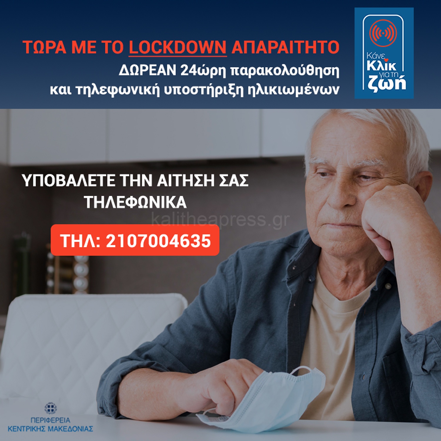 Ένα πρόγραμμα αυτόνομης και ασφαλούς διαβίωσης το «Κλικ ζωής» που υποστηρίζεται από την Περιφέρεια Κεντρικής Μακεδονίας και χρηματοδοτείται από την Ευρωπαϊκή Ένωση, έρχεται να συνδράμει ως προς της καλυτέρευση ζωής των ηλικιωμένων. Πρόκειται για ένα σύστημα έγκαιρης ειδοποίησης που λειτουργεί 24 ώρες το 24ωρο , 7 ημέρες την εβδομάδα και 365 ημέρες το χρόνο.