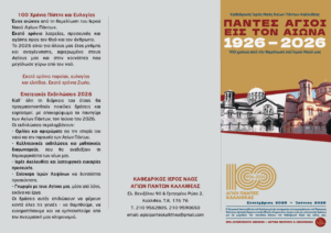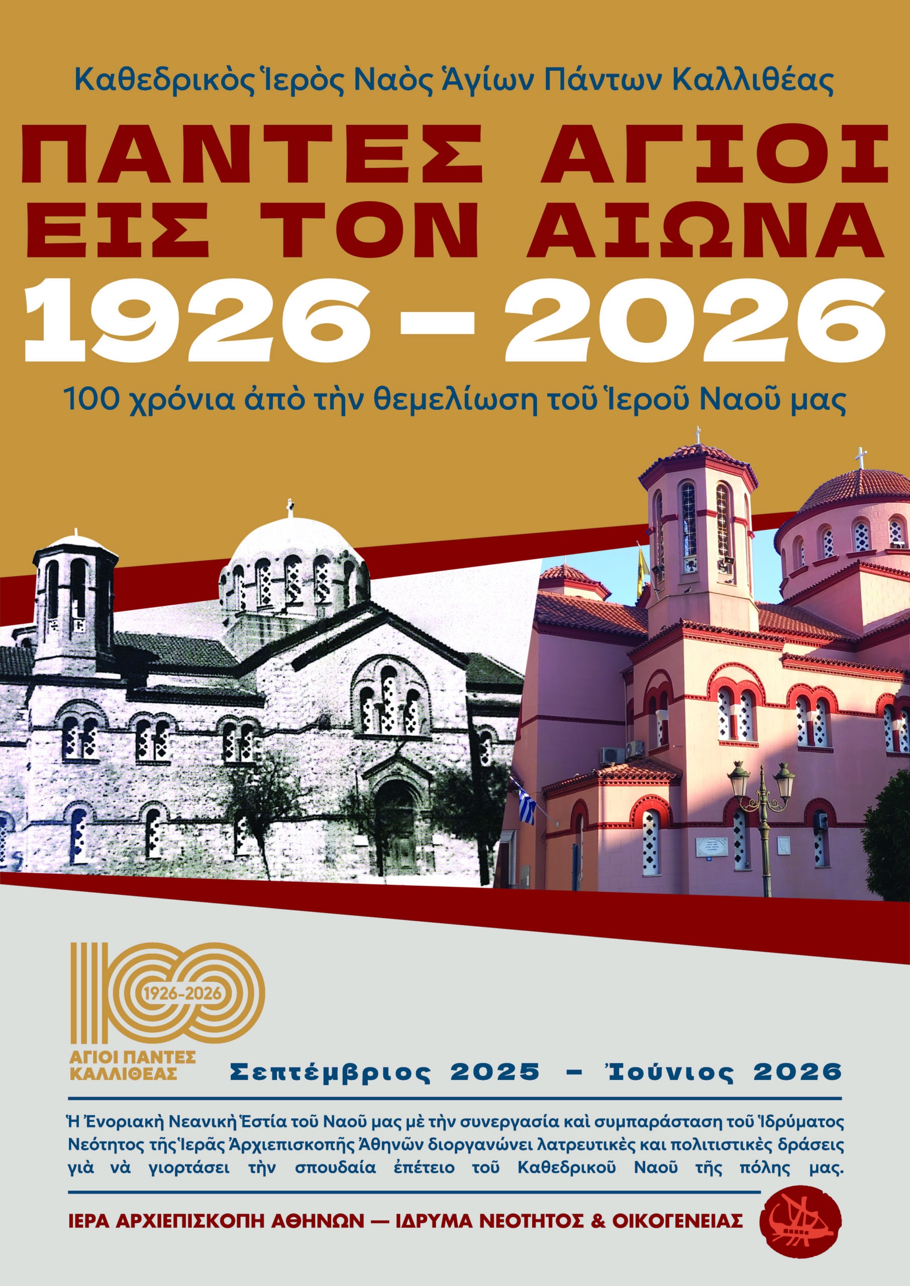 Ναός των Αγίων Πάντων Καλλιθέας. Με αυτόν τον τρόπο, ο Καθεδρικός Ναός της Καλλιθέας (επί της Λεωφόρου Ελ. Βενιζέλου/Θησέως) αρχίζει τις εκδηλώσεις, που θα «τρέχουν» καθ’ όλη τη διάρκεια του εκκλησιαστικού έτους με αφορμή τη συμπλήρωση 100 χρόνων από τη θεμελίωσή του (1926-2026).
