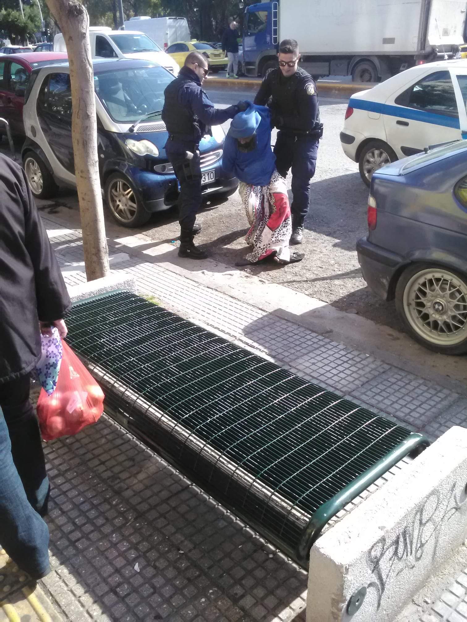 Giorgos Kallitheas :”Μετά από πολλά τηλέφωνα στην κοινωνική υπηρεσία και αρκετές ενημερώσεις στην διοίκηση του Δήμου Καλλιθέας για τον άστεγο που βρίσκεται μήνες στην οδό Θησέως βρέθηκε επιτέλους η λύση. Βίαιη σύλληψή του αστέγου”,