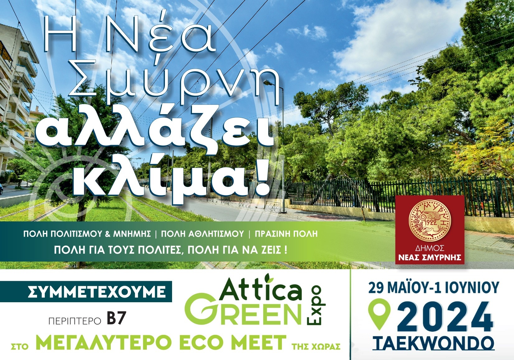 Ενεργά συμμετέχει ο Δήμος Νέας Σμύρνης στην ATTICA GREEN EXPO (29/5 – 1/6, Γήπεδο Tae Kwon Do) τιμώντας την Παγκόσμια Ημέρα Περιβάλλοντος. Η έκθεση που έχει περιβαλλοντικό και κοινωνικό πρόσημο, δίνει την δυνατότητα στους πολίτες να ενημερωθούν για τις στις σύγχρονες προκλήσεις που αντιμετωπίζουν οι πόλεις.