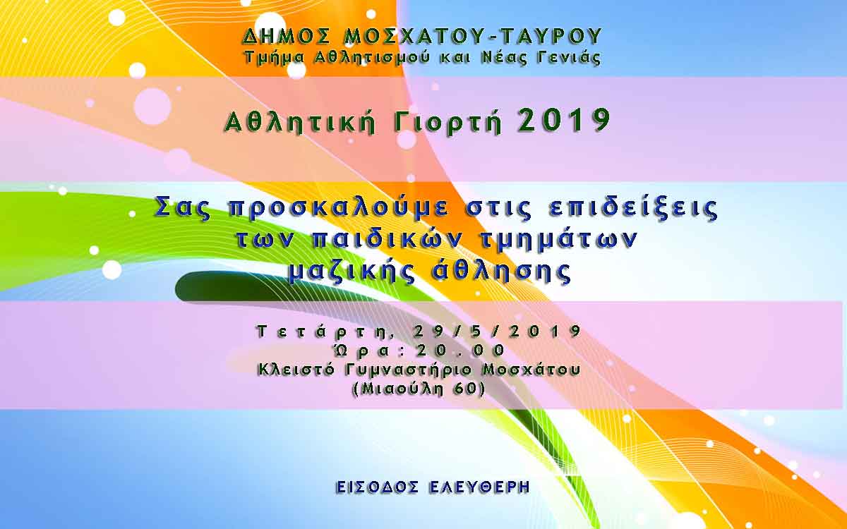 Σας προσκαλούμε στην “Αθλητική Γιορτή 2019”με επιδείξεις των παιδικών τμημάτων μαζικής άθλησης που θα λάβει χώρα την Τετάρτη 29 Mαϊου και ώρα 20:00,στο Κλειστό γυμναστήριο Μοσχάτου (Μιαούλη 60) Πλοήγηση άρθρων 40 χρόνια Ελλάδα ΕΕ Eπετειακό βίντεο Αποτελέσματα Εκλογών 2019: Οι 15 Δήμοι της Αττικής που δεν “ψηφίζουν” δεύτερη Κυριακή