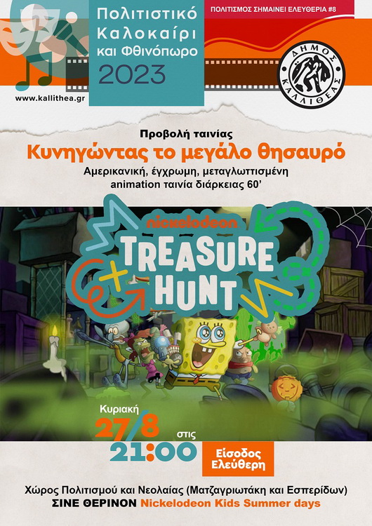 21:00 Χώρος Πολιτισμού και Νεολαίας (Ματζαγριωτάκη και Εσπερίδων) – ΣΙΝΕ ΘΕΡΙΝΟΝ Nickelodeon Kids Summer days – Προβολή ταινίας «ΚΥΝΗΓΩΝΤΑΣ ΤΟ ΜΕΓΑΛΟ ΘΗΣΑΥΡΟ» – Έγχρωμη, μεταγλωττισμένη animation ταινία , διάρκειας 60′