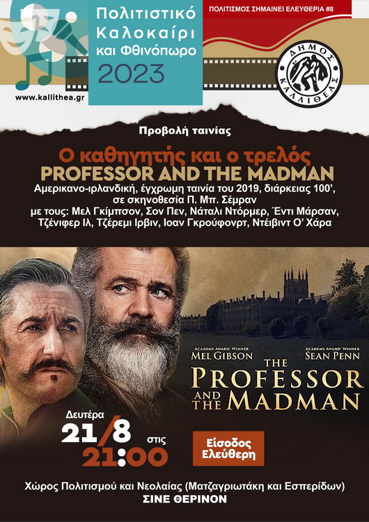 21:00 Χώρος Πολιτισμού και Νεολαίας (Ματζαγριωτάκη και Εσπερίδων) – ΣΙΝΕ ΘΕΡΙΝΟΝ Προβολή ταινίας «PROFFESSOR AND A MADMAN / Ο ΚΑΘΗΓΗΤΗΣ ΚΑΙ Ο ΤΡΕΛΟΣ» – Αμερικανο-ιρλανδική, έγχρωμη ταινία του 2019, διάρκειας 100′