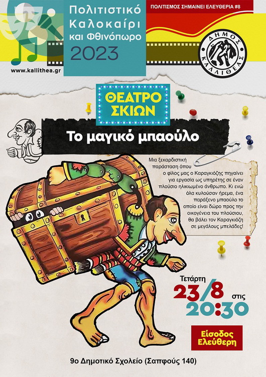 20:30 9ο Δημοτικό Σχολείο ( Σαπφούς 140) Θέατρο Σκιών «Το μαγικό μπαούλο»