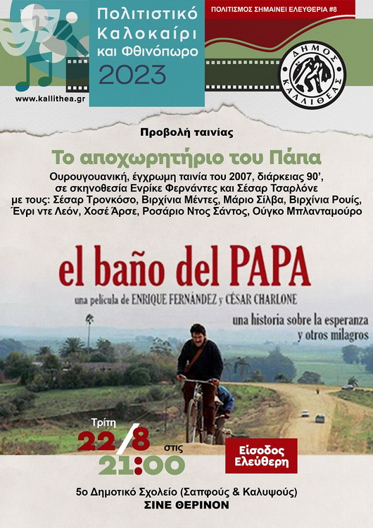 21:00 5ο Δημοτικό Σχολείο (Σαπφούς & Καλυψούς) – ΣΙΝΕ ΘΕΡΙΝΟΝ Προβολή ταινίας «Το αποχωρητήριο του Πάπα» – Ουρουγουανική , έγχρωμη ταινία του 2007, διάρκειας 90′