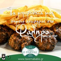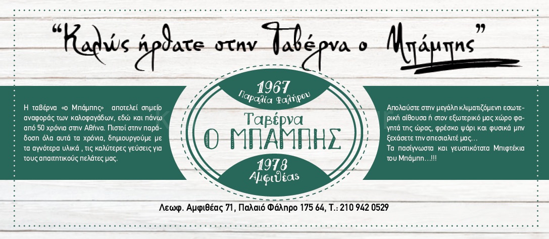 Στην Αθήνα, στα Νότια προάστια όταν βρεθείς και πεινάσεις σίγουρα μια ταβέρνα που θα είναι πρώτη επιλογή σου θα είναι η ΤΑΒΕΡΝΑ ΜΠΑΜΠΗΣ στη Λεωφόρο Αμφιθέας 73 στο Παλαιό Φάληρο, με παράδοση που ξεκινά από το 1967. Μια ταβέρνα που πρωταγωνιστεί εδώ και 50 χρόνια. Τα μπιφτέκια είναι σήμα κατατεθέν αλλά και αν λαχταρήσατε παραδοσιακό ελληνικό φαγητό