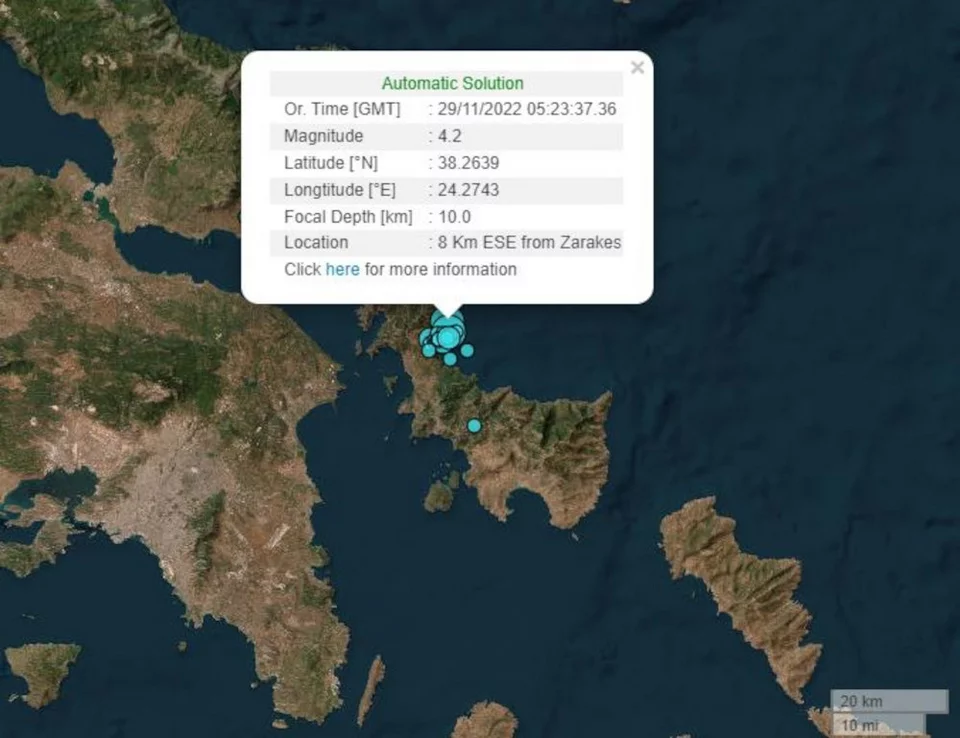 - Ο τέταρτος σεισμός (14:44) είχε μέγεθος: 2.8 R και επίκεντρο: 3 χλμ Νοτιοανατολικά των Ψαχνών Ευβοίας με εστιακό βάθος: 15 χλμ.
