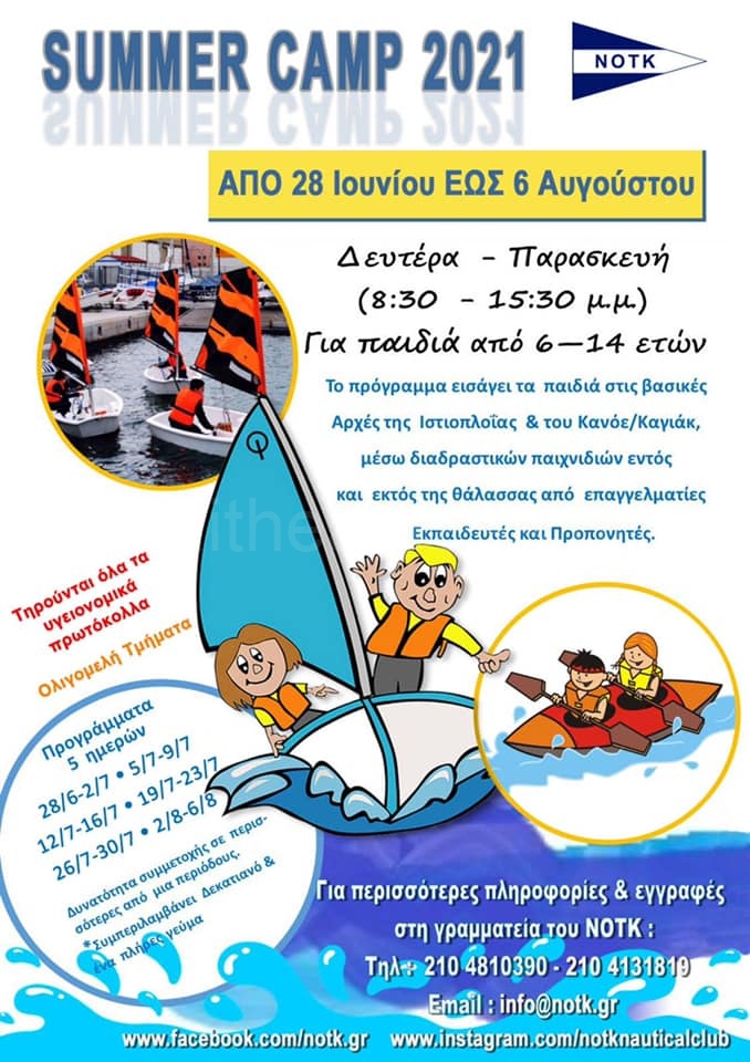 Ο Ναυταθλητικός Όμιλος ΝΟΤΚ όπως κάθε χρόνο ξεκινά και πάλι το summer cump ιστιοπλοΐας αλλά και τα καθημερινά μαθήματα μετά από μια μικρή διακοπή λόγω της πανδημίας τηρώντας όλα τα απαραίτητα μέτρα προστασίας.