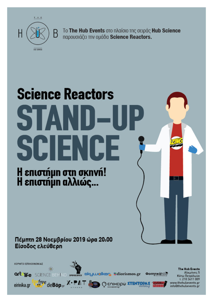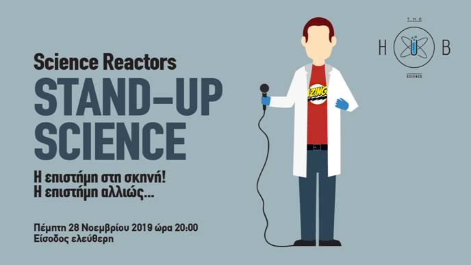 Την Πέμπτη 28 Νοεμβρίου 2019, στις 20:00 σας προσκαλούμε στη δεύτερη φετινή συνάντηση του Hub Science, στο πλαίσιο του οποίου θα πραγματοποιηθεί η παράσταση της ομάδας Science Reactors με τίτλο «Stand–up Science».